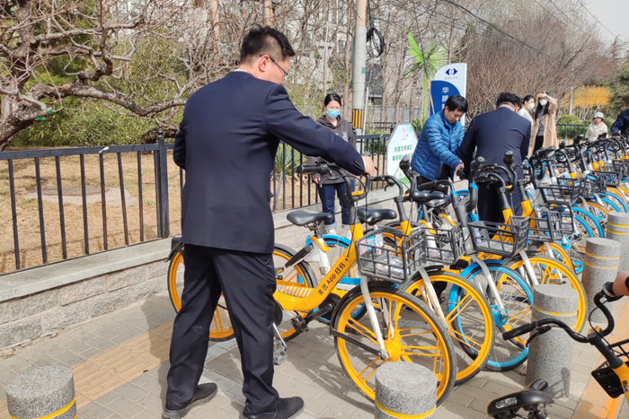 團員青年們來到華騰新天地商場南門,將雜亂停放的共享單車擺放整齊,并引導前來停放共享單車的人們規范停放,優化商場的周邊環境,避免商場周邊因為隨意停車造成的交通混亂和安全隱患。