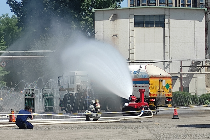 演練從“恐怖分子襲擊液氧槽車沖撞氫氣瓶組”開始,單位立即啟動應急預案,開展初期處置;消防隊開展危化品車輛著火滅火、氫氣瓶組泄漏處置。演練共設企業自救、處置移交、火場偵察、警戒封控、疏散救人、稀釋驅散、現場處置、危險轉運、全面洗消9項流程。演練中,消防隊共出動消防作戰車輛9輛,消防指戰員52名,北普公司參加應急演練人員28名。