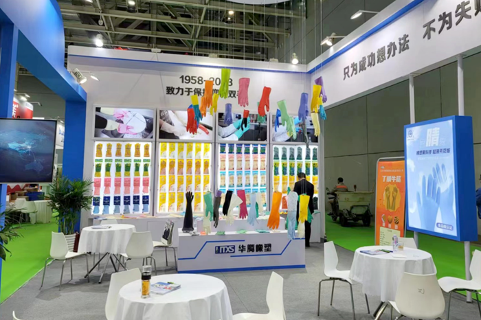 新的LOGO不僅展示著企業新形象,更昭示著華騰橡塑融入國內大循環、國內國際雙循環的雄心。10月15日,華騰橡塑銷售團隊專程來到廣州,參加第134屆中國進出口商品交易會(廣交會),在“工具展區”和“新材料及化工產品展區”架設兩大展位,全面推銷橡塑乳膠手套產品和膠板產品。在手套產品展位,展示了公司的家用手套和工業用手套。多種材質、用途可以充分滿足客戶的不同需求。公司自主研發的絕緣手套和干箱手套備受觀眾關注;在膠板產品展位,展示了工業、牧場、運動等系列膠板產品,花型種類豐富,可滿足多種場合的應用需求。
