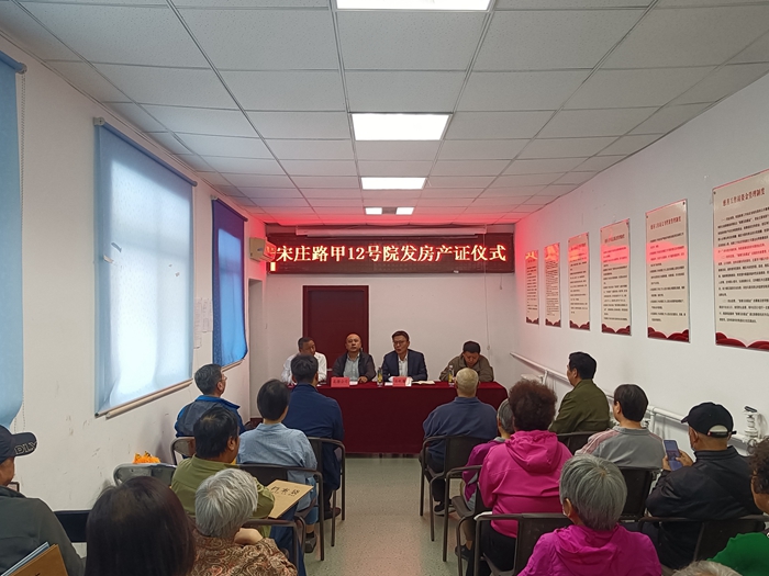 4月25日上午,東鐵匠營街道第二社區會議室門前被一團喜慶氣氛所環繞。宋莊路甲12號院的54戶住戶接過期盼已久的房產證,每個人的臉上都洋溢著幸福的喜悅。此時,化工廠“宋莊路甲12號院發放房產證儀式”正在這里舉行。